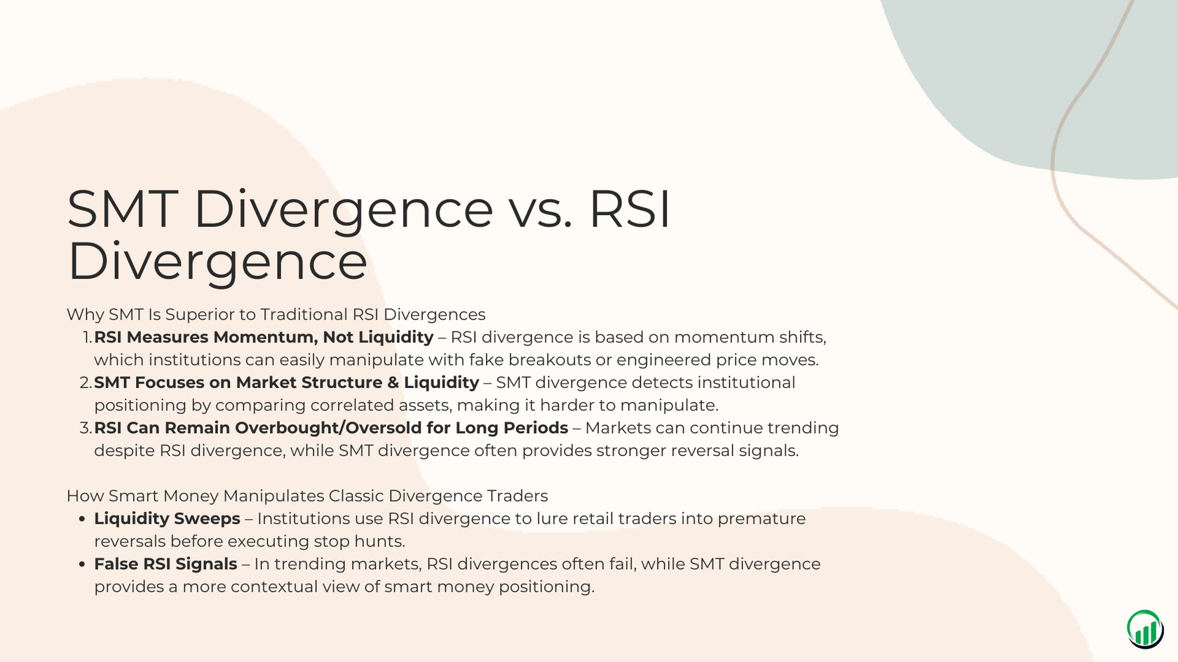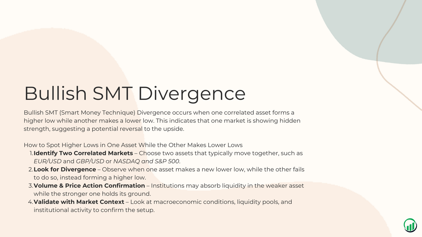 SMT Divergences help you spot when the market is being manipulated or when a major move is about to occur. This powerful technique is used by institutional-level traders, and now you can learn it completely free.